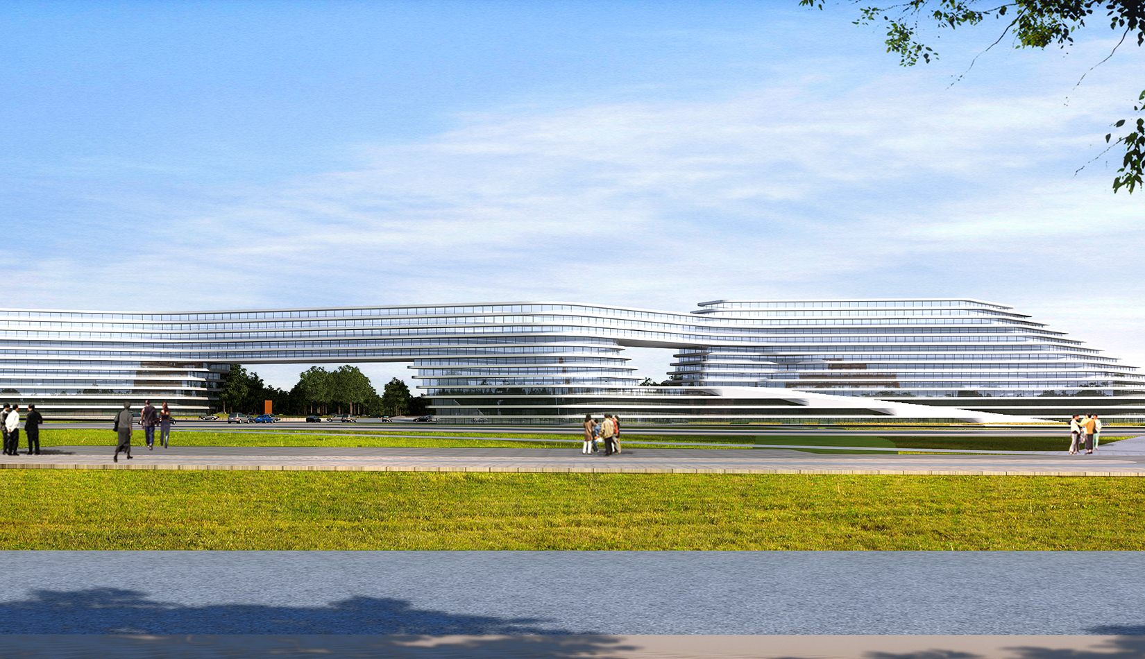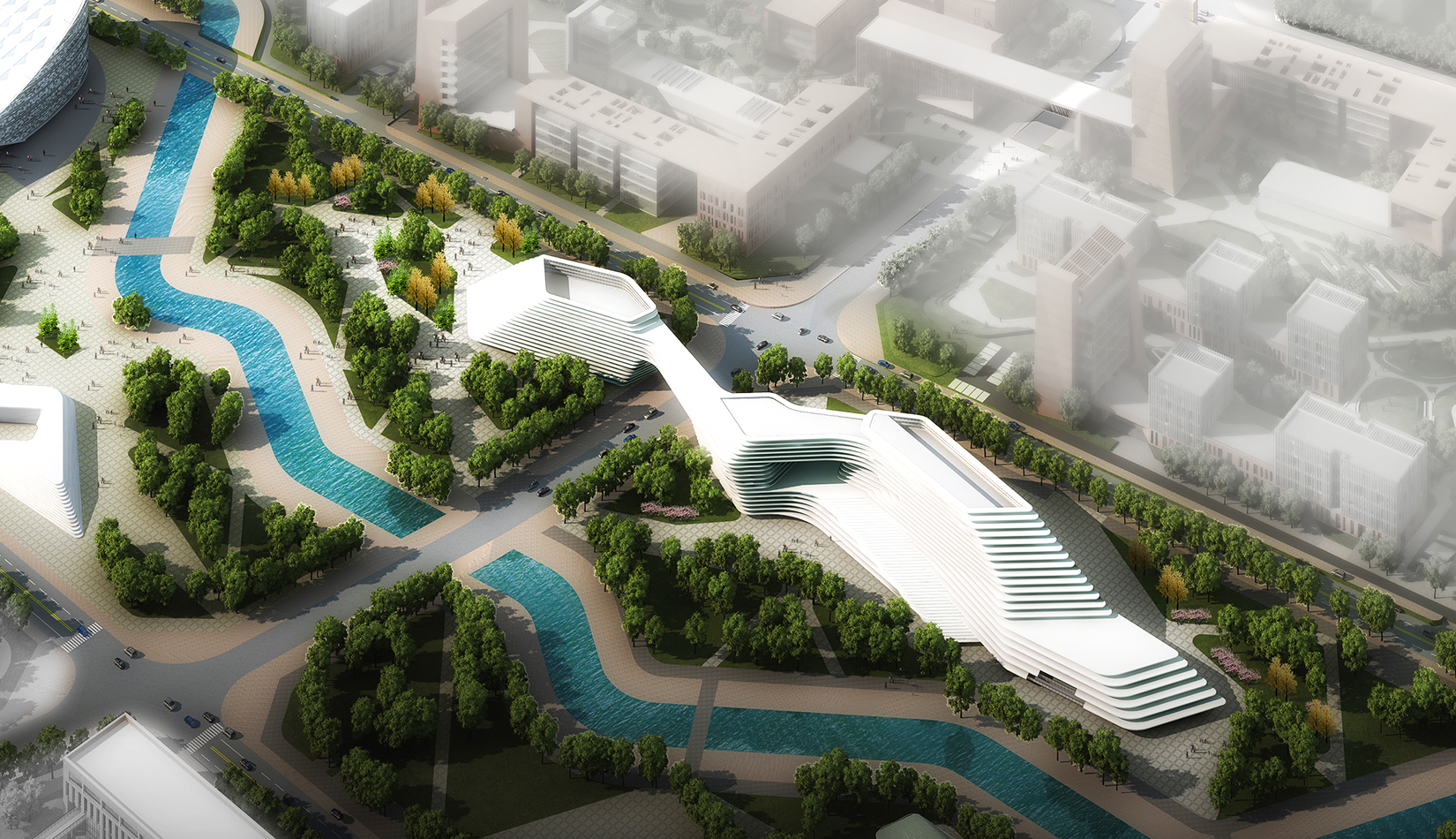 科學(xué)講堂位于中心區(qū)景觀主軸的中心腹地,其南的泄洪渠為景觀主軸的景觀帶。設(shè)計靈感源于中國天人合一的自然觀和社會觀,所謂仁者樂山智者樂水,通過對山、水肌理的分析與重構(gòu),轉(zhuǎn)換為建筑語言,形成獨具特色的建筑造型。建筑體量形成簡單、沖突的場地氛圍,建筑南向正對園區(qū)中軸線,使得水平向延展的建筑生成了“東高西低”的無邊際界面。由“水面→河岸→場地→建筑”的溪水肌理驅(qū)動建筑臨街面,逐步退后產(chǎn)生特有的河流沖刷意象。水流的蜿蜒曲折使建筑的轉(zhuǎn)彎處成洞,達(dá)到了內(nèi)外視線連續(xù)的綜合效果,并將對建筑的擠壓力平衡到建筑東西兩翼。建筑表皮通過對水的情緒變化等模擬,形成片狀的建筑造型。