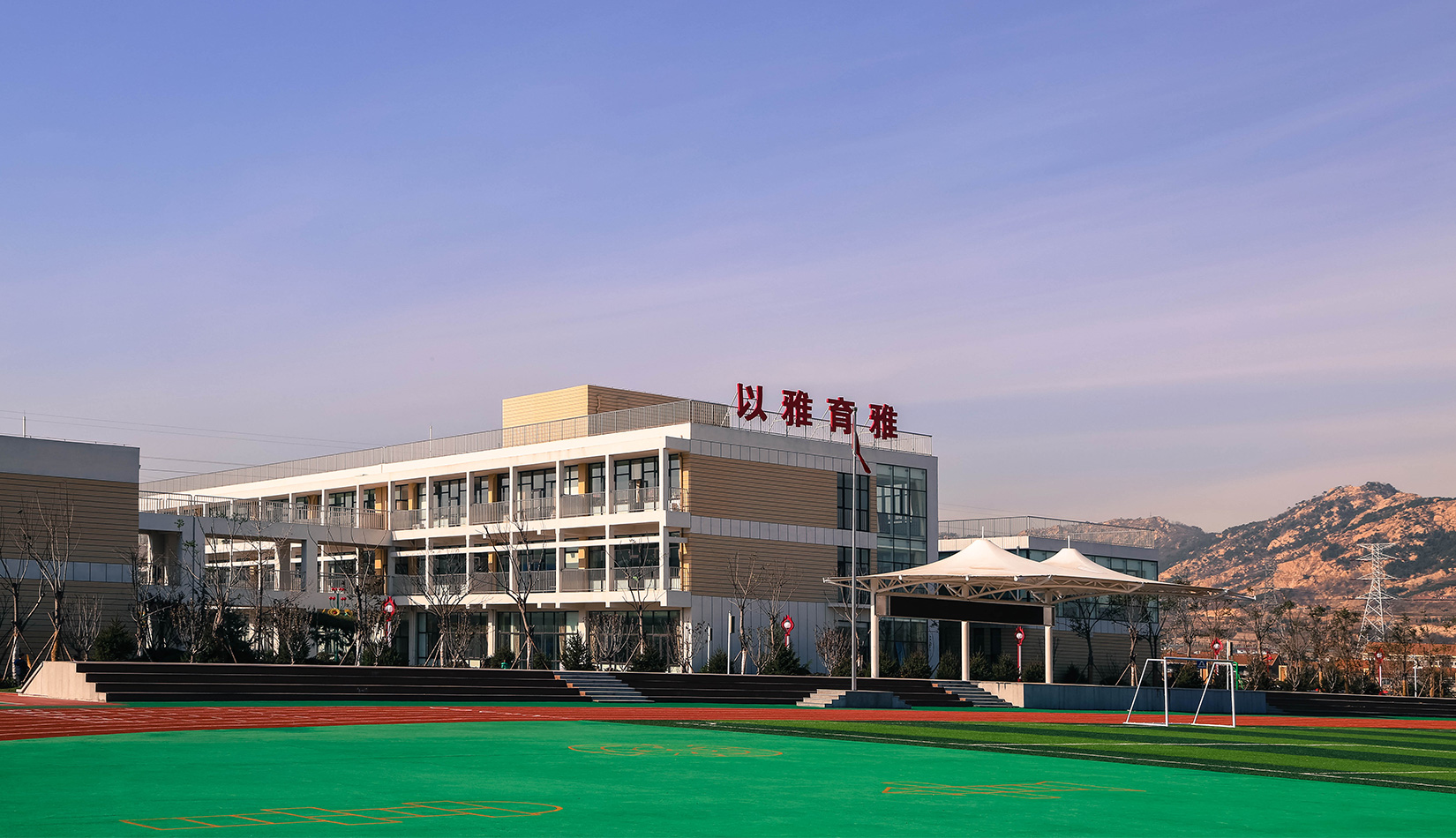 該項(xiàng)目通過(guò)幾個(gè)建筑單體與架空走廊的穿插連接將整個(gè)校區(qū)有機(jī)聯(lián)系起來(lái),實(shí)現(xiàn)了建筑功能的整體性,完善了建筑可達(dá)性。形成的中庭空間可成為交流為主的平臺(tái),營(yíng)造了學(xué)習(xí)、活動(dòng)為一體的校園氛圍。建筑外立面以簡(jiǎn)潔的現(xiàn)代風(fēng)格為主,同時(shí)表現(xiàn)校園文化,主要采用黃色與白色真石漆形成色彩對(duì)比,在教室南立面、樓梯間、就餐區(qū)等采用整體通透的玻璃幕墻與實(shí)墻形成虛實(shí)對(duì)比,形成簡(jiǎn)潔而不失活潑的建筑風(fēng)格。利用借景等手法進(jìn)行室外綠化設(shè)計(jì),整體打造一個(gè)高品質(zhì)的學(xué)校環(huán)境。