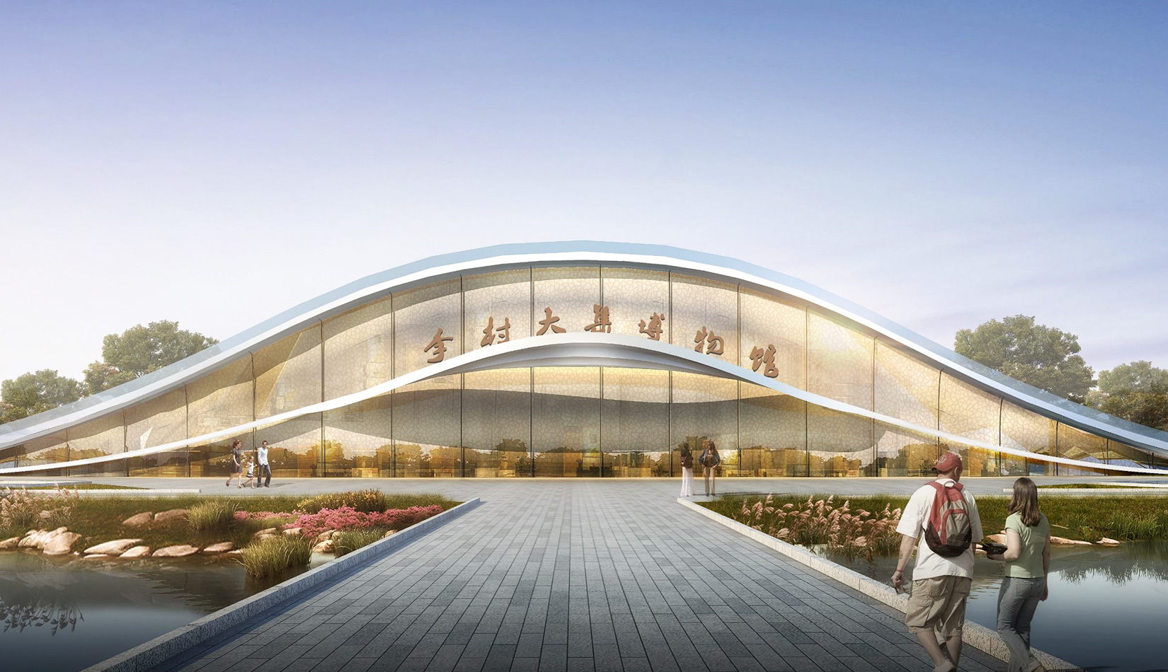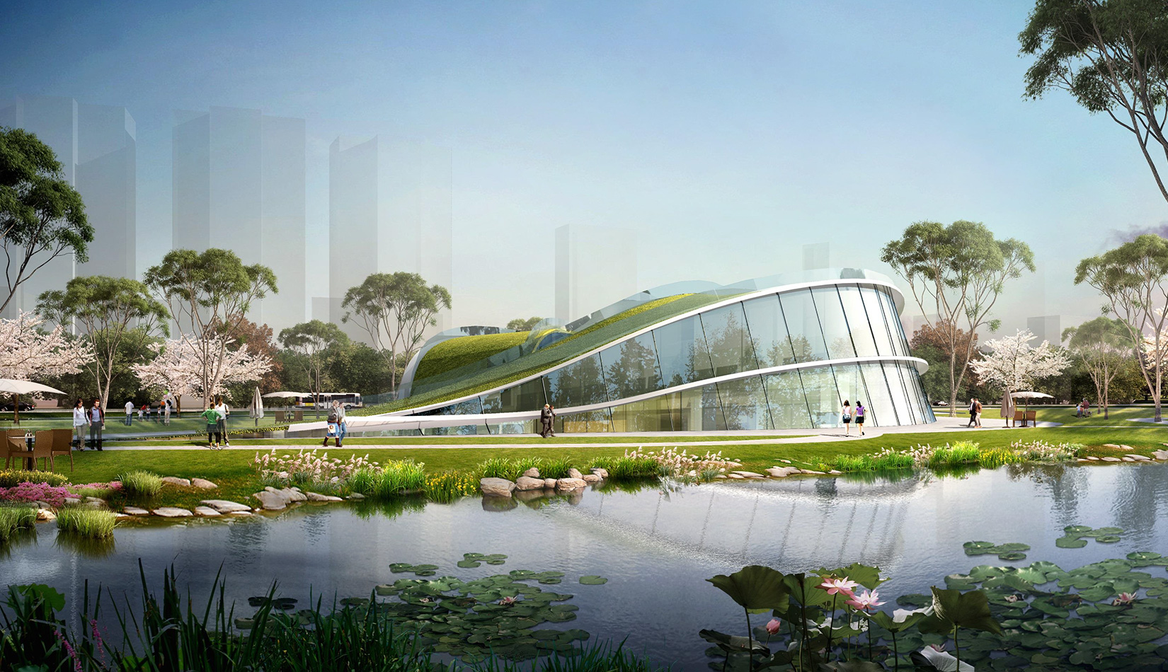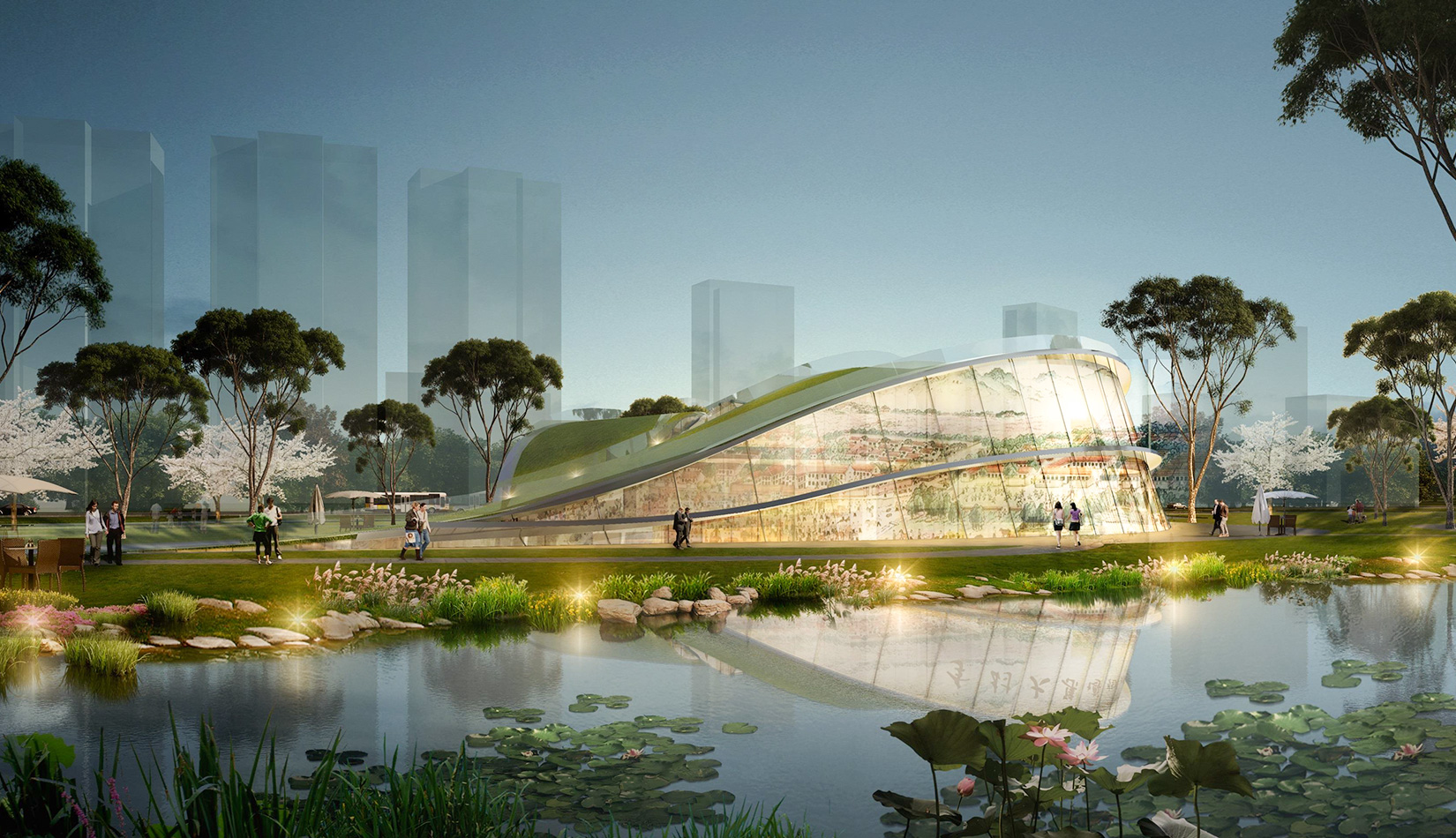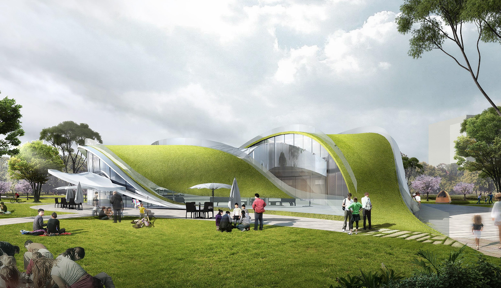 該項目基地位于濱河公園內,目標要將博物館打造成一個生態(tài)建筑,建筑能與環(huán)境有機融合。在這一理念下,將博物館設計為樹葉形,建筑猶如一片樹葉飄落在公園內,以此體現(xiàn)建筑與環(huán)境的融合。將樹葉形建筑設計為覆土建筑,最大程度還原基地一片綠色,以此呼應李村大集的“還原”內涵。通過設計兩個曲線形體相互交融形成建筑的最終體量,以此體現(xiàn)相逢意蘊,呼應李村大集的“相逢”內涵。